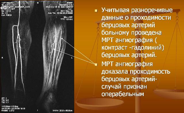 МРТ ангиография является высокодостоверным методом обследования артерий берцового сегмента при решении вопроса «операбельности» больных с критической ишемией, возможности проведения органосохраняющих операций.