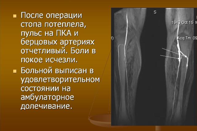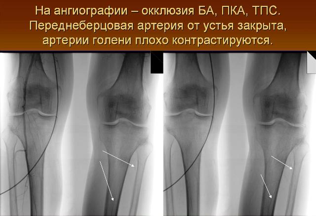 Учитывая проходимость берцовых артерий от ампутации решено воздержаться и выполнить бедренно-двухберцовое шунтирование.