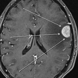 Пациентка М. поступила в нейрохирургическое отделение с жалобами на сильную головную боль и слабость в правых конечностях. Была произведена РКТ головного мозга, где была выявлена опухоль левой лобной доли. Для уточнения диагноза в ГАУЗ РТ БСМП была произведена МР-томография с МР-спектроскопией. Были получены данные о метаболическом составе очага, что точно соответствовало метастатическому поражению. При последующем онкопоиске первичного очага был выявлен Са правой молочной железы и метастазы в позвонке.