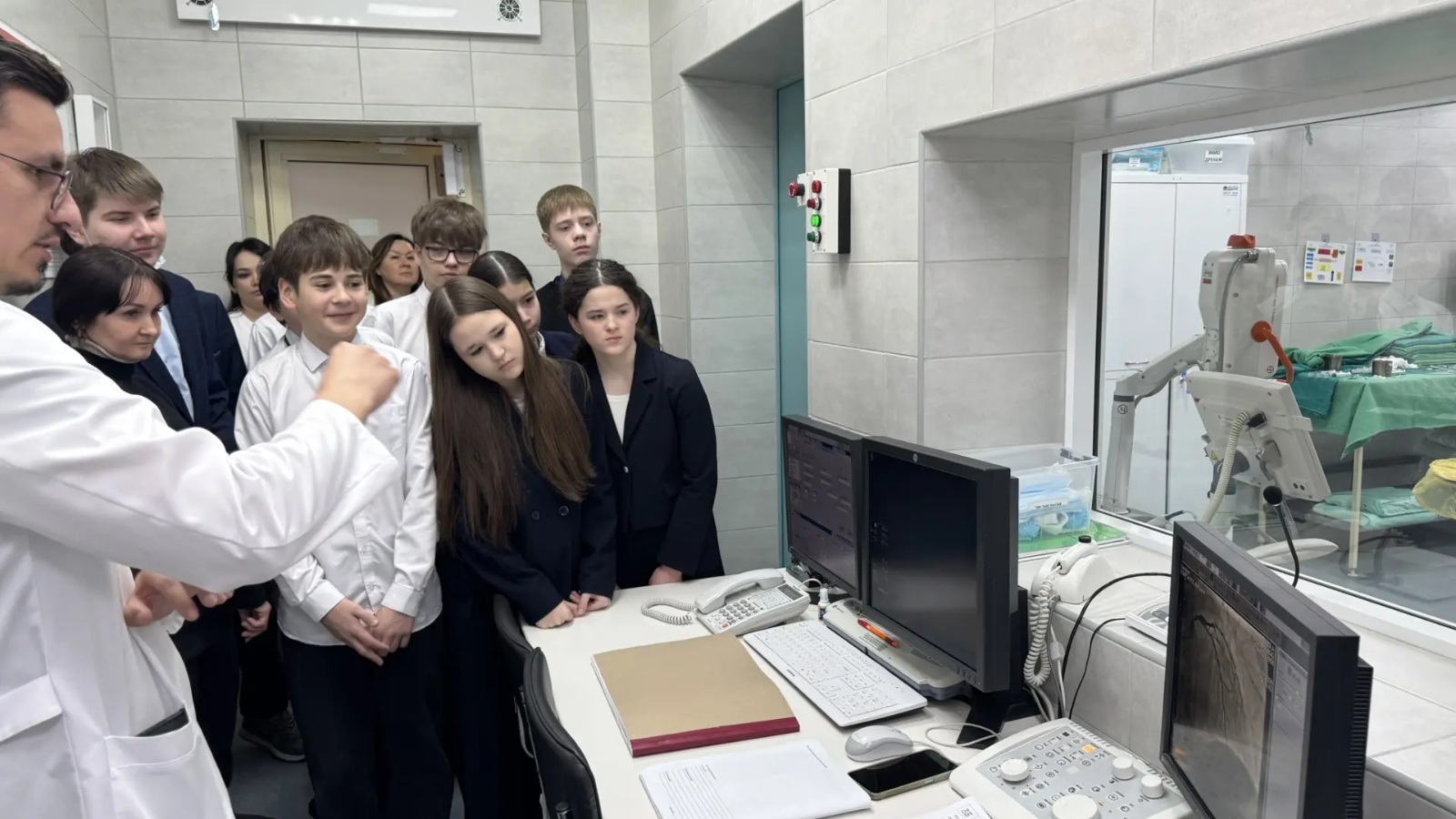Ребята посмотрели, как работают аппараты МРТ и КТ, изучили под микроскопом образцы в клинико-диагностической лаборатории, а также посетили музей БСМП, приемно-диагностическое отделение, шоковый зал, заглянули в пультовую операционной и восхитились работой наших хирургов. Снимки реальных операций школьники смогли поближе рассмотреть в галерее сердечно-сосудистой хирургии. В отделении эндоскопии им продемонстрировали процедуру извлечения инородного тела из «желудка».