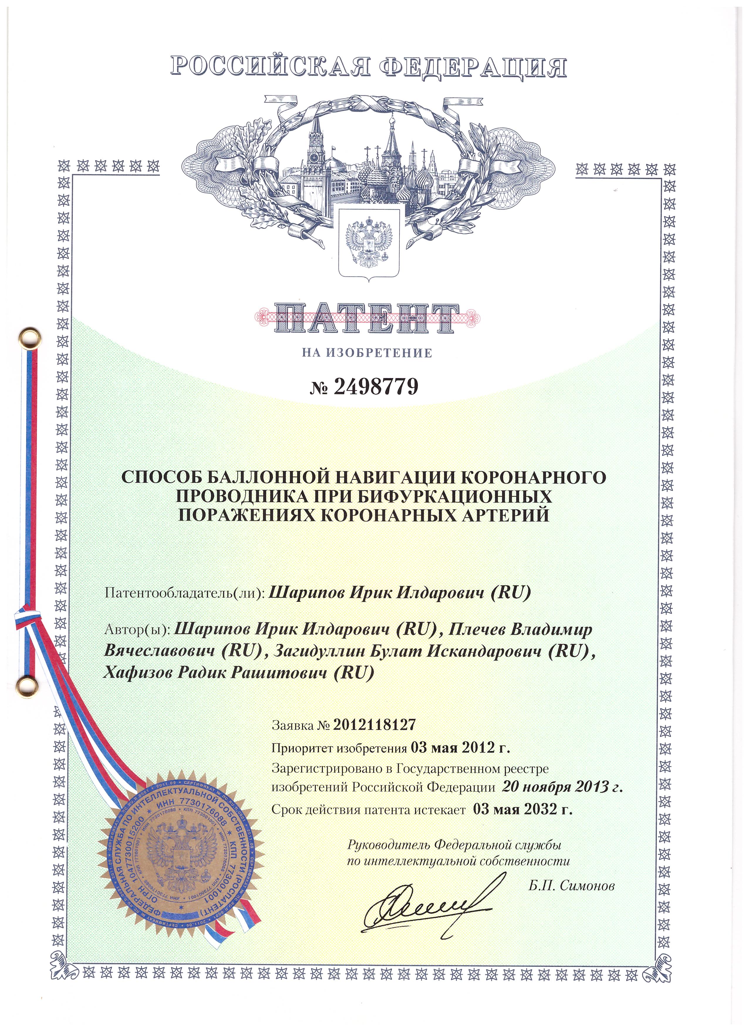 В ГАУЗ РТ «БСМП» отделением рентгенохирургических методов диагностики и лечения получен патент на изобретение № 2498779 от 20.11.2013г. «Способ баллонной навигации коронарного проводника при бифуркационных поражениях коронарных артерий».