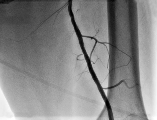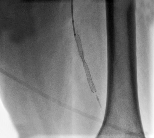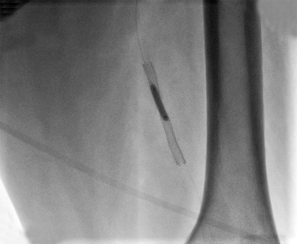 Рис. "Завершение эндоваскулярного этапа - контрольная ангиография: поверхностная бедренная артерия без остаточного стеноза, магистральный кровоток без препятствий, стент раскрыт полностью."