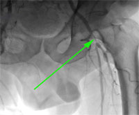 Рис.1. Дооперационная ангиография. Стеноз левой общей бедренной артерии до 90%.