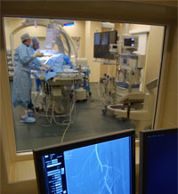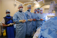 Рис. "Операционная бригада (слева направо): Сестра-анестезистка Зарипова Р.Я., Сальников А.В., Загидуллин Б. И. (Отделение эндоваскулярной хирургии); Кобзев Е.Е., Чахоян А.М. (Отделение сосудистой хирургии)"