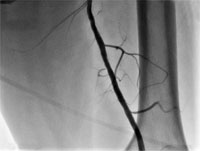 Рис.2. Дооперационная ангиография. Стеноз левой поверхностной бедренной артерии в среднем сегменте до 80%.