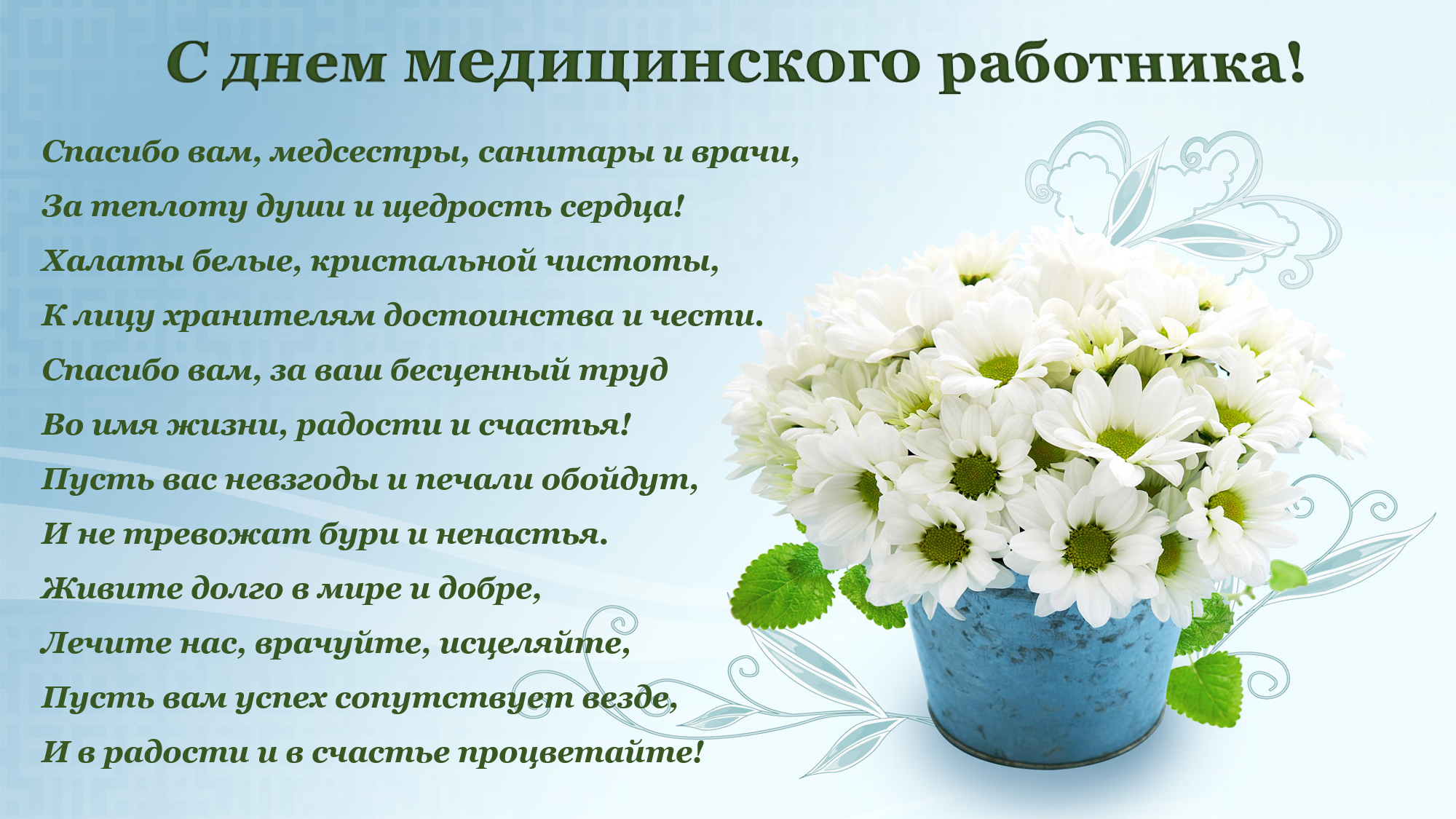 Уважаемые и дорогие коллеги! Поздравляем Вас с Днём медицинского работника. Примите слова искренней благодарности за Ваш талант, усердный труд, золотые руки, добрые и щедрые сердца. Желаем крепкого здоровья Вам и Вашим семьям, удачи и успешной деятельности, личного процветания, бодрости и силы, на много долгих, славных лет!